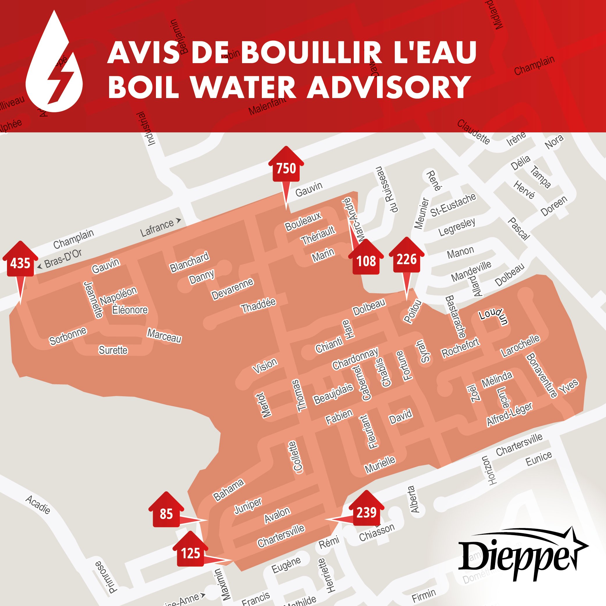 Un avis de bouillir l’eau est émis pour les résidents situés dans les quartiers avoisinants. La zone touchée par l’avis de bouillir l’eau est celle en rouge dans la carte en pièce jointe.